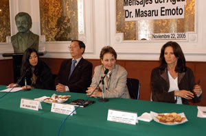 Al compartir su trabajo de análisis ético-espiritual sobre la Belleza Oculta del Agua, el Dr. Masuro Emoto señaló que el globo terráqueo está constantemente asediado por el descuido de los hombres y así como ciudades y pueblos se inundan de aguas negras, también la estabilidad de los humanos podría verse afectada. Consideró que la polarización entre países ricos y pobres van acompañados de otras inequidades como la mala distribución del agua y sus consecuencias en cuanto a calidad, como lo testifican las fotografías que realizó al agua corriente de distintas partes del mundo. Indicó que experiencias llevadas a cabo en su investigación, mostraron como los efectos de determinados sonidos y otros agentes, alteran la estructura molecular del agua, con lo que se obtuvieron imágenes de cristales (especies de joyas) y de “destrucción”. “Lo importante de este trabajo es comprender que si el agua es el reflejo del alma humana y nuestro cuerpo se constituye de 70% de este líquido, lo que pasa afuera (como las joyas que reflejan las fotografías) también pasa dentro de nosotros. El Dr. Maseru Emoto advirtió que los desastres naturales que se viven actualmente, como los huracanes, son reflejo de la destrucción que estamos haciendo del planeta y del equilibrio, “y el agua nos puede reflejar el por qué de tanta destrucción dentro y fuera de nosotros, y el por qué de tanta energía mala y destructiva. Si actuamos con amor, verdad, rectitud, paz y no-violencia, conseguiremos reestructurar nuestras vidas y, en consecuencia, el mundo estará a salvo”. Al respecto, la presidenta de la Comisión Especial para la Gestión Integral del Agua, Martha Delgado Peralta, señaló que en la ciudad de México, principalmente en la zona poniente se vive diariamente el drama de no recibir agua en cantidad y calidad suficientes, y eso forma una fotografía de inequidad que al pasar de los años no encuentra solución. Indicó que por ello es importante conocer todo tipo de investigaciones y experiencias, que reflejen la importancia que tiene para la subsistencia el agua y el cuidado del medio ambiente. A la conferencia acudieron el presidente de la Comisión de Gobierno, Carlos Reyes Gámiz, la presidenta de la Comisión de Medio Ambiente, Sara Figueroa y la presidenta de la Comisión de Desarrollo urbano, María Elena Torres Baltasar, quien junto con Martha Delgado, entregaron un reconocimiento como visitante distinguido de la Asamblea Legislativa al Dr. Emoto.
